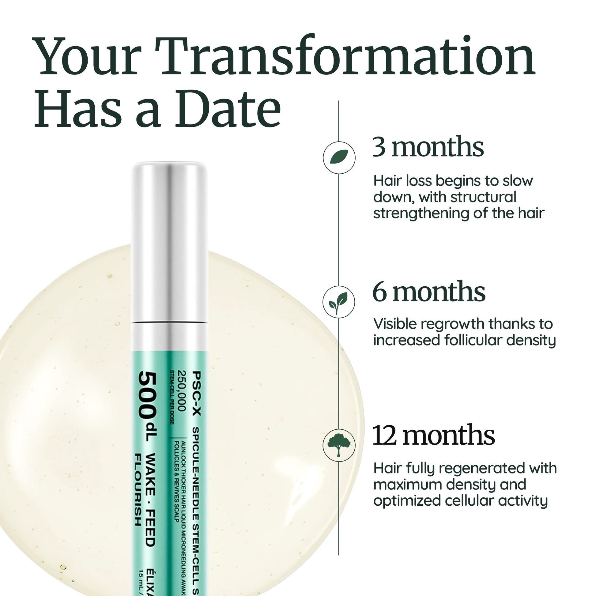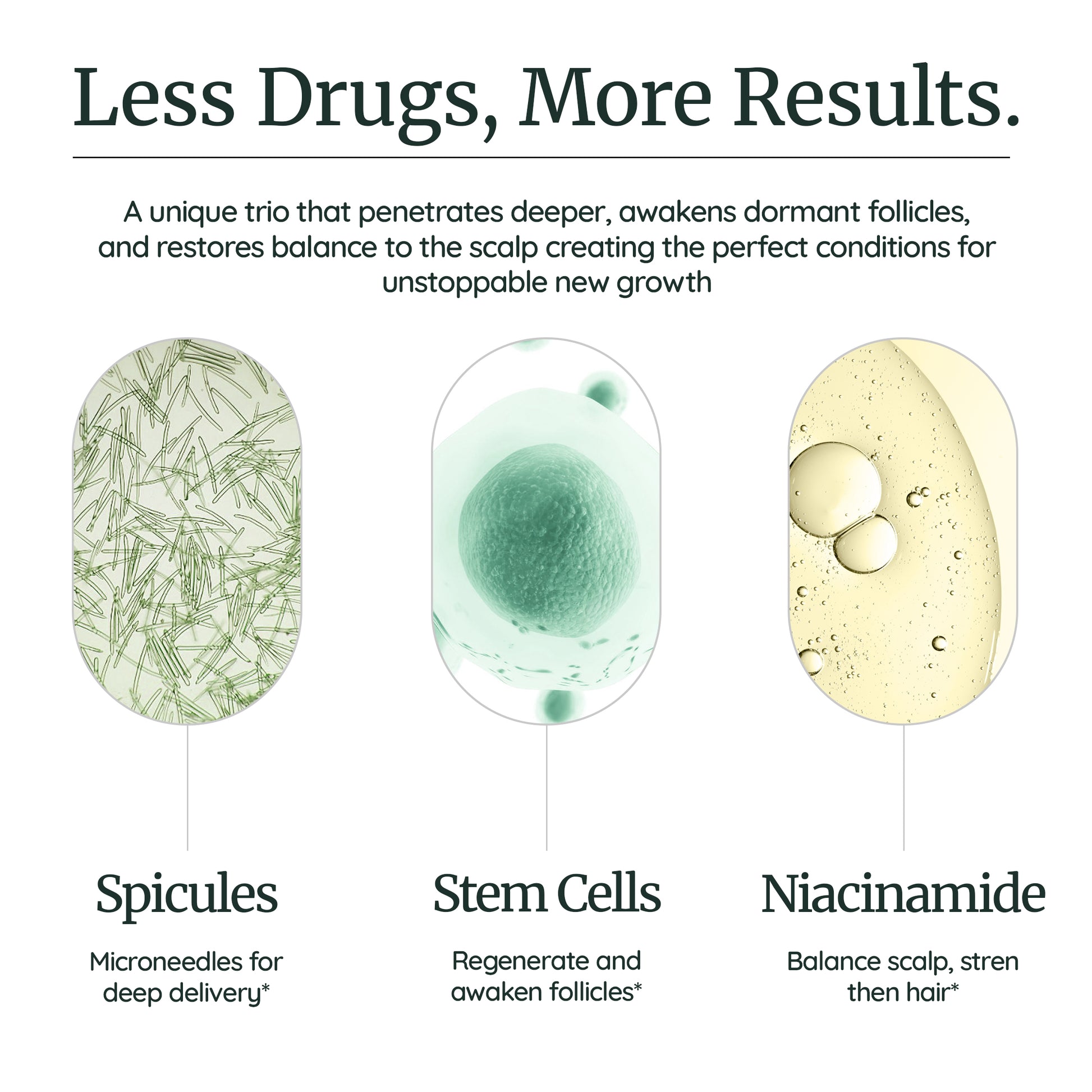 Liquid microneedling spicules (needle‑free) open temporary microchannels and dissolve for deep, gradual delivery; a phyto‑stem + peptide complex reactivates follicles; niacinamide, caffeine, zinc PCA rebalance the scalp.